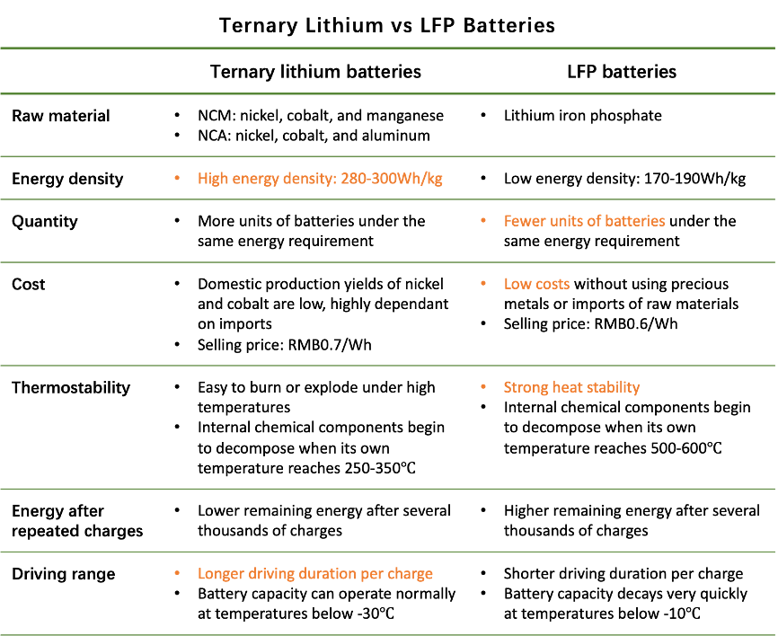 The popularity of NCM/NCA batteries in recent years is mainly due to the longer driving range per charge than that of LFP batteries, as well its ability to withstand colder temperatures. The average energy density of mass-produced ternary lithium batteries is higher than 200 watt-hours (Wh) per kilogram (referring to battery packs other than a single battery cell, similarly hereinafter), and CABIA stated that it has even achieved records of 280-300Wh/kg. Limited by technical issues, LFP batteries’ energy density was only 100-110Wh/kg in 2012 and recently has increased to 170-190Wh/kg. Moreover, LFP battery capacity decays much faster at low temperatures or in cold areas than at normal temperatures and that of ternary lithium batteries.