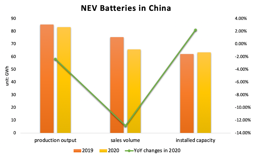 sales@senecaesg.comChina Automotive Battery Innovation Alliance (CABIA), on January 13, published battery data for new energy vehicles (NEVs) for 2020. Last year, the cumulated production yield and sales volume of batteries were 83.4 gigawatts (GWh) and 65.9GWh, respectively, down 2.3% YoY and 12.9% YoY due to the pandemic outbreaking at the beginning of 2020. Later, in the second half of 2020, incented by preferential policies for new car purchases to recover from the pandemic, the installed capacity of NEV batteries increased 2.3% YoY to 63.6GWh.