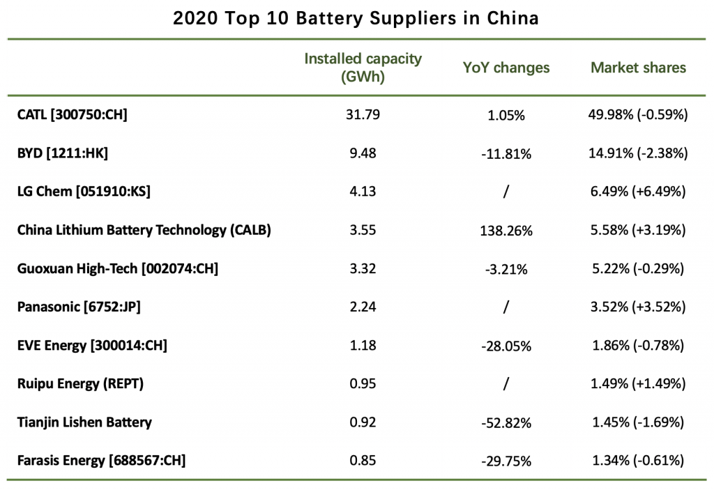 Contemporary Amperex Technology (CATL) has remained China’s largest battery maker in 2020, followed by BYD . As Tesla’s battery suppliers in the country, LG Chem and Panasonic first entered the top ten list last year, through soaring sales of Tesla’s China-made Model 3 cars. Notably, LG Chem and Panasonic both supply ternary lithium batteries, while CATL, Tesla’s other supplier, has offered LFP batteries for the US company since July 2020. Tesla has already ordered 200,000 sets of LFP batteries from CATL for 2021, amounting to 11GWh. In addition to the two production lines reserved for Tesla, CATL also has two other production lines of LFP batteries to offer multiple carmakers its products, such as SAIC-GM-Wuling Automobile (SGMW), Xpeng, NIO , etc. Furthermore, CATL has taken over half of the LFP battery market in 2019 by 11.28GWh in capacity installed on coaches and special vehicles, and it is also expanding into electric heavy trucks, electric ships, and other green sectors. According to Eastmoney, CATL’s LFP battery output in 2021 is expected to exceed 30GWh.
