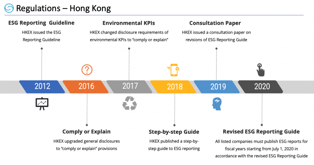 Up to now, 60 stock exchanges globally have published ESG reporting guidance to regulate their listed companies, according to the United Nation Sustainable Stock Exchanges Initiative (UN SSE). Hong Kong, as a pioneer of China, is taking its path to becoming a global hub of green finance, and imposes increasingly stringent ESG disclosure requirements for listed companies during these years.