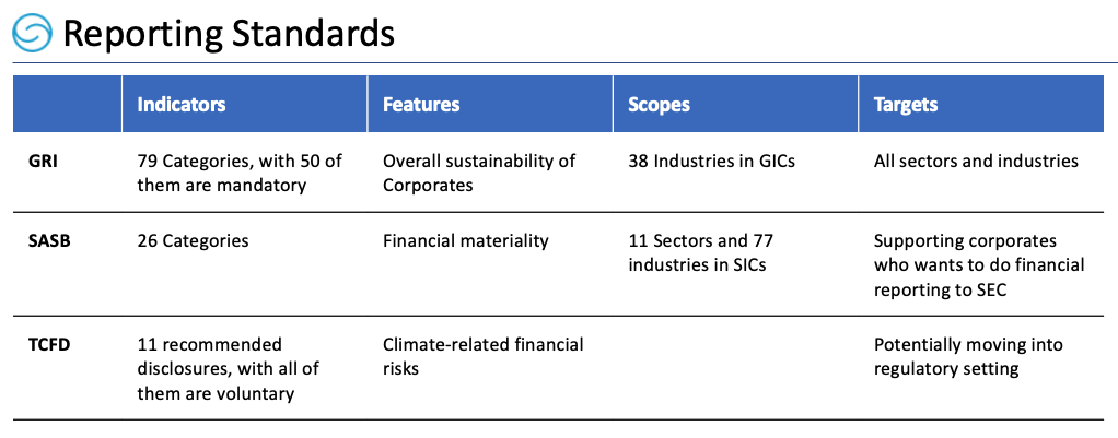 Going beyond regulatory compliance, companies are encouraged to align or reference various international reporting standards and frameworks in the development of their ESG or sustainability report. That means if a company adopts the global acknowledged standards referenced by stock exchanges, the company could save lots of efforts when doing ESG reporting. According to the UN SSE, ESG reporting instruments referenced in stock exchange guidance documents are mainly from the six organizations: GRI, SASB, IIRC, CDP, TCFD, and CDSB. Among them GRI, SASB and TCFD are globally accepted ones which cover all ESG topics. Here enclosed the comparison for reference: