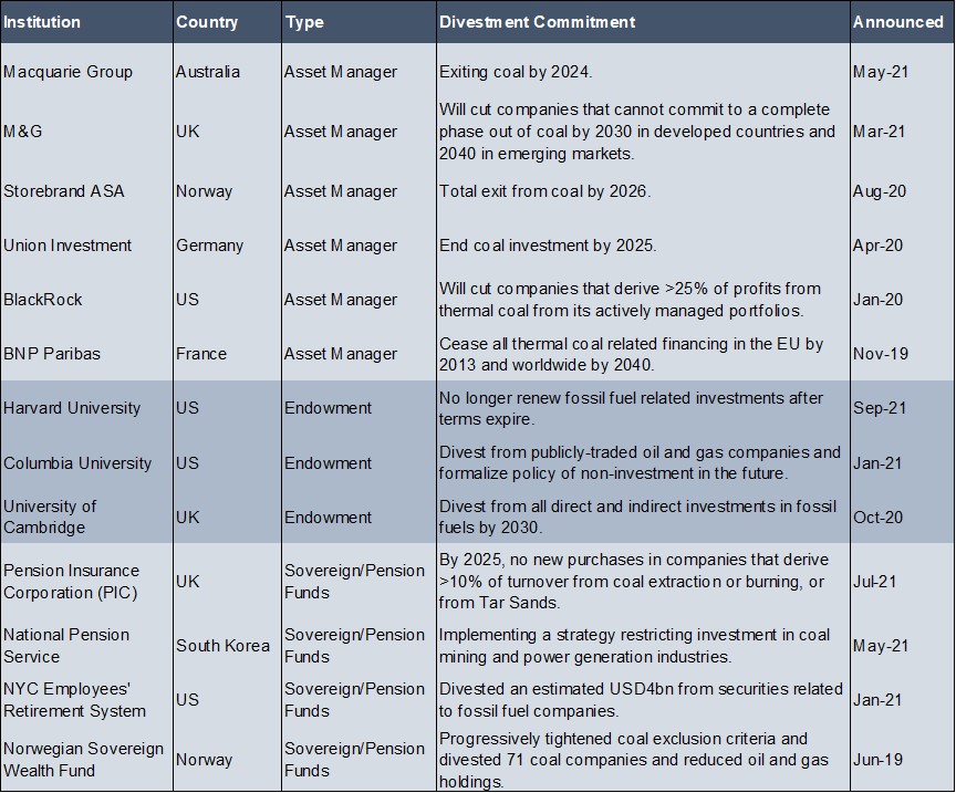 The decision to divest from fossil fuels may be driven by pressure from shareholders for environmental responsibility as well as considerations to dampen climate-related risks. With the pandemic starting in 2020, many institutions are forced to reckon with other deeply challenging systemic risks such as climate change, contributing to a new wave of climate-related divestment. The table below shows some examples of recent fossil fuel divestment commitments from various institutions.