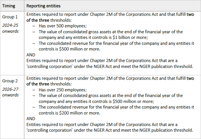 In summary, tables 1 and 2 outline the timelines for entities to begin reporting based on the set criteria. The criteria include gross consolidated assets, consolidated revenue, and number of employees, and they apply to both the company or entity and any entities it controls at the end of the financial year.