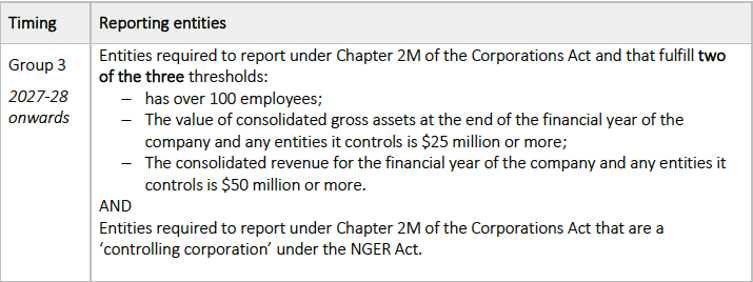 Additionally, entities registered as a ‘Controlling Corporation’ reporting under the National Greenhouse and Energy Reporting Act 2007 would also be subject to climate-related risk disclosure requirements, regardless of meeting the threshold criteria. Major financial institutions are already covered under Chapter 2M, and registrable superannuation entities will be included from July 1st 2023, eliminating the need for separate thresholds.