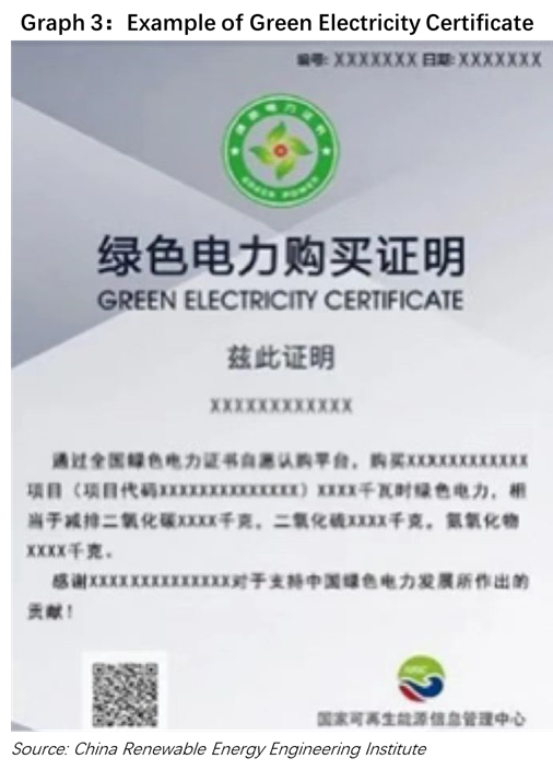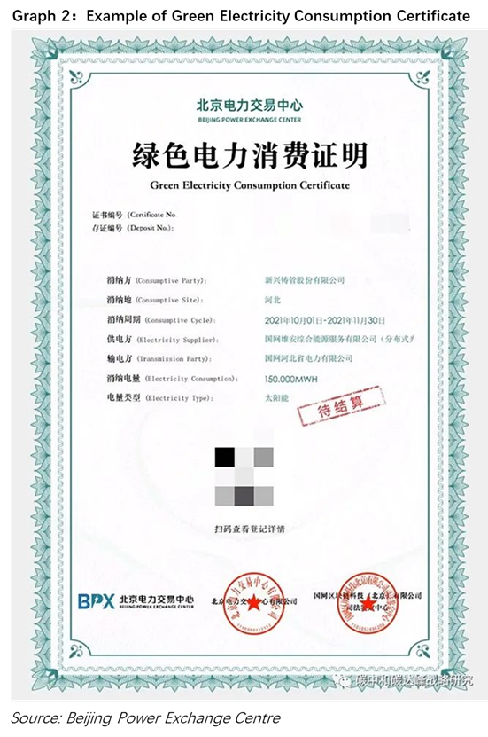 Once the transaction is completed, the end user of green electricity can obtain a Green Electricity Consumption Certificate (as shown in Graph 2) issued and verified by Beijing Power Exchange Center. This certificate enhances the credibility of the trade as it records and makes traceable all the information about the life cycle of the purchased green power. The end user can then use this certificate as evidence of renewable energy use and directly reduce its scope 2 emissions (carbon emissions attributed to purchased energy) in its carbon accounting.
