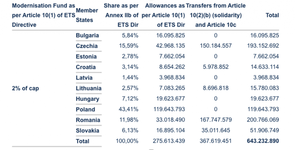 The Modernization Fund supports investments that comply with the 2030 climate and energy objectives of the European Union, as well as the Paris Agreement signed in December 2015 (3). The majority of the resources and financing which comes from revenues generated by 2% of auctioned emission allowances is one of the key funding instruments. The table below shows the total amount of allowances per beneficiary Member State for the 2021-2030 period.