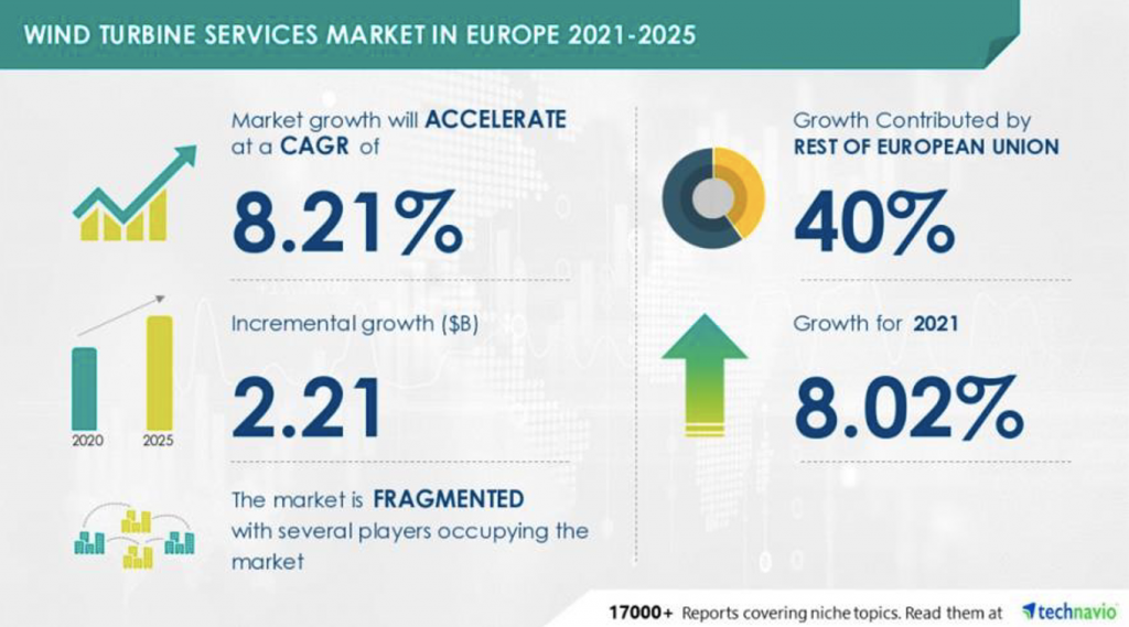 Europe produced nearly all the wind turbines installed on the continent last year in the EU with expected growth forecasts set to see the industry grow by USD2.21bn from 2021 to 2025.