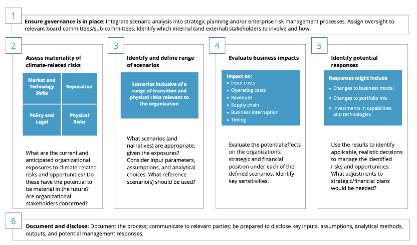The chart below is TCFD’s recommended process for applying scenario analysis to climate related risks and opportunities: