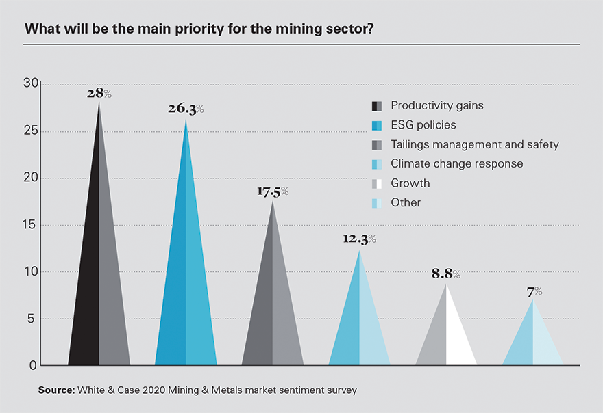 In regards to the expectation from investors in the mining industry, in an annual 2020 survey conducted by White & Case, more than a quarter of senior decision-makers expect a continued focus on productivity gains to be the number one priority for the sector. Pursuing ESG policies, dealing with tailings dams and responding to the challenges of climate change were all seen as more important than growth. Just under nine percent of the respondents said that growth would be the leading goal this year.
