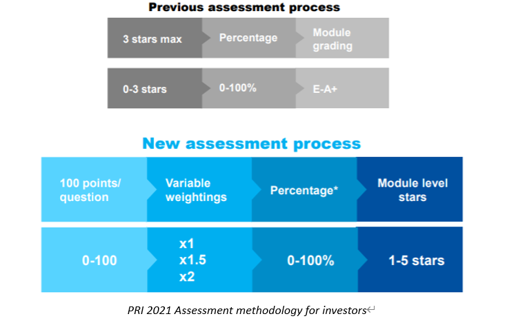 In the new framework, only Core indicators will be assessed. At the initial phase, PRI applies 100-point principle for each question. A higher score refers to a more advanced ESG practice or a larger number of questions answered. The second advancement in the assessment process involves assigning different weights to different questions. The calculation is based on the criteria of low weighted questions being multiplied by 1, moderate questions by 1.5, and high by 2. This process can highlight the importance of each indicator regarding responsible investment practice. Next, a percentage is calculated as total points achieved divided by total points of indicators relevant to the signatory in the module. In the final step, a five-star assessment reflects performance reported in each module in a more straight-forward manner. In general, the new assessment procedure is more flexible for investors to improve their performance based on the score and weight for each indicator.