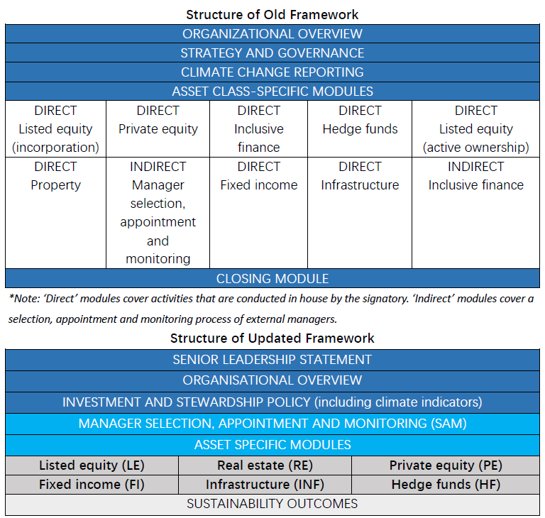 The updated framework contains 11 reporting modules for investors, shifting from the previous 13 modules. Compared to the 2020 framework, it combined several asset-level modules and added one module named senior leadership statement. The new module can function as an introduction to the audience of a company’s performance on responsible investment and requires signatures from chief-level officers or similarly senior managers. Thus, this module could increase internal awareness and accountability for PRI reporting, as well as enhance the top-down management on PRI report and responsible investment.