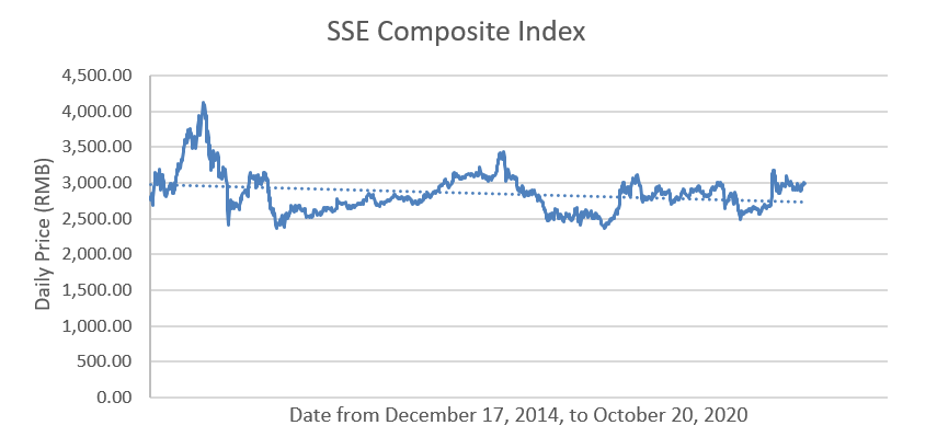 Comparatively, China Securities Index disclosed that the SSE Composite Index, which tracks all stocks traded on SSE, recorded a five-year annualized return of 0.91% as of October 19, 2020, and a closing price of 2,991.5 on October 20, 2020. Additionally, though the index’s closing price on December 17, 2014 stood at 2,812.66, the following chart graphs a slight downward movement overall from December 17, 2014, to October 20, 2020.