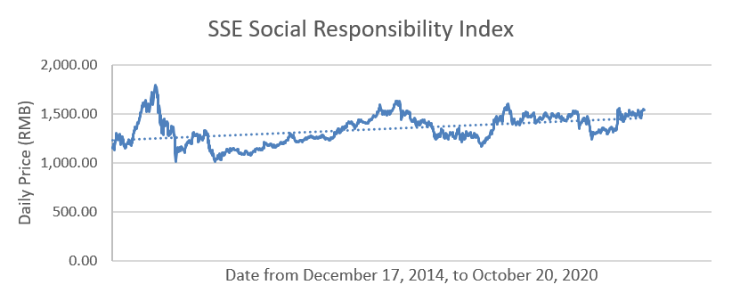 The lack of standardized and comparable ESG data is one of the main challenges for those who aim to make responsible investments in China’s markets. For investors, ESG investment, which goes beyond traditional investment based on financial data and enables investors to identify underperforming companies as well as potential financial risks, is likely to generate higher long-term returns. Specifically, China Securities Index Company (CSI) reported that the SSE Social Responsibility index recorded a 4.97% annualized return in a five-year period ending on October 19, 2020. SSE Social Responsibility index tracks the stocks of SSE listed companies that have favorable CSR performance, including Ping An Insurance Group and China Merchants Bank . Additionally, the following graph shows the index movement from December 17, 2014, to October 20, 2020, citing data from Investing.com. With the index’s closing price growing from RMB1,152.21 on December 17, 2014 to RMB1,542.66 on October 20, 2020, the index presents an overall upward trend over the period, signaling public companies with better ESG performance have more stable stock price growth.